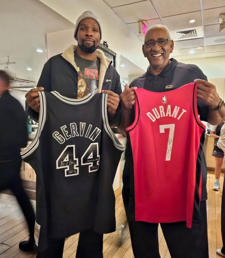 賽前,杜蘭特和馬刺名宿“冰人”喬治-格文交換球衣。