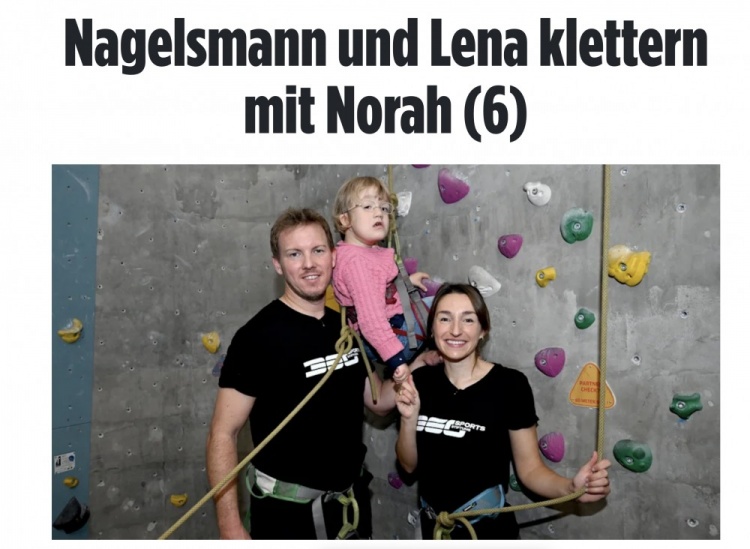 納格爾斯曼在場(chǎng)地里與這對(duì)由于一種罕見的基因缺陷而在身體上受限的兄妹一同攀向高處。通過這一行動(dòng),納格爾斯曼和女友支持了RTL基金會(huì)旗下“我們幫助孩子協(xié)會(huì)”以及RTL電視臺(tái)的募捐馬拉松活動(dòng)。