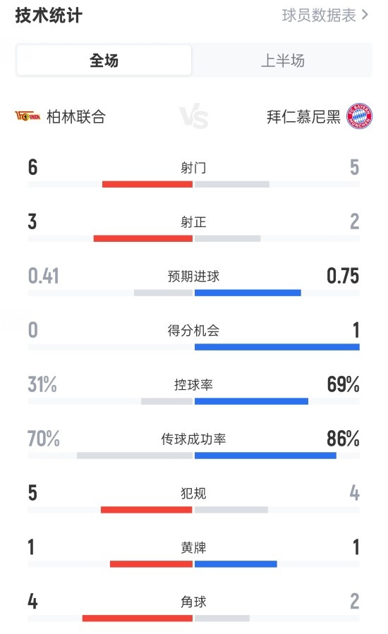 11月8日訊 2025-26賽季德甲聯(lián)賽第 10輪,柏林聯(lián)合主場迎戰(zhàn)拜仁,半場戰(zhàn)罷兩隊(duì)暫 1-1戰(zhàn)平。