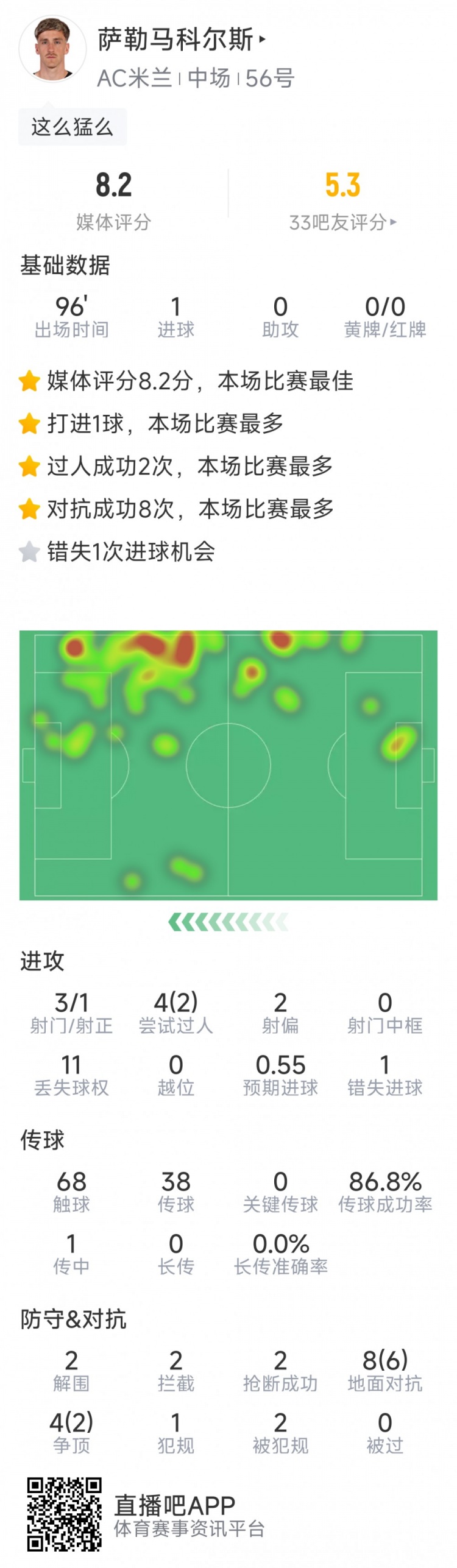 11月9日訊 在本輪意甲,AC米蘭2-2戰(zhàn)平帕爾馬,以下為薩勒馬科爾斯本場(chǎng)數(shù)據(jù):