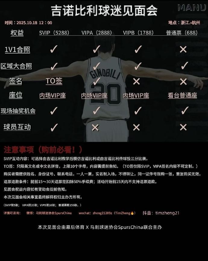 吉諾比利在杭州的球迷見面會,SVIP票價為5288元,VIPA為2888元,VIPB為1788元,普通票為688元。