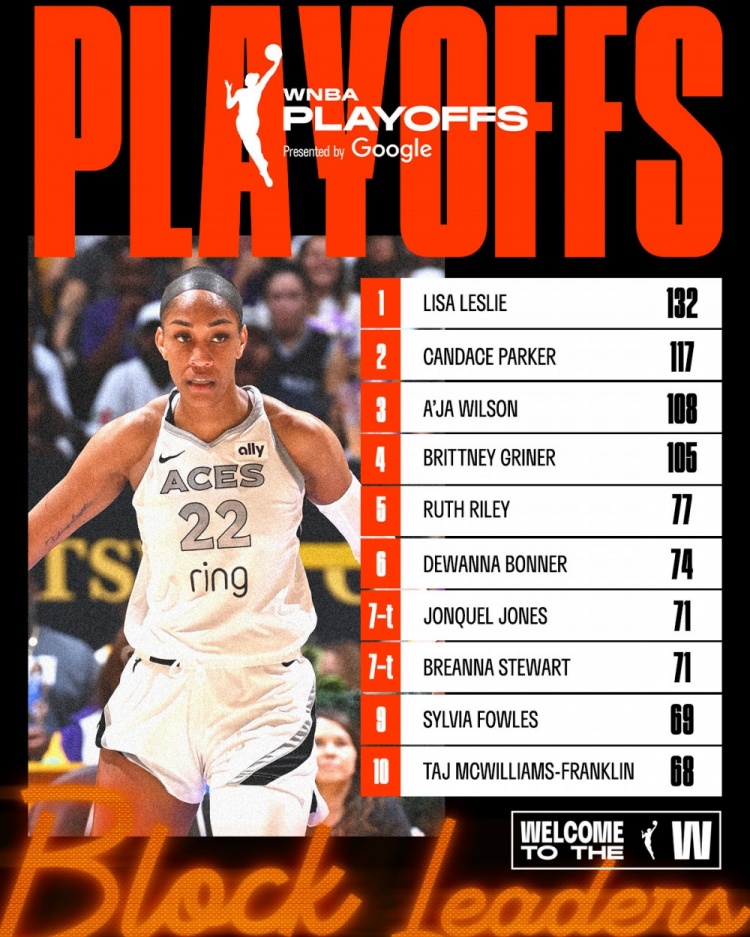 據(jù)統(tǒng)計(jì),本場過后阿賈-威爾遜在季后賽蓋帽數(shù)來到108個(gè),她也超越格里娜,獨(dú)居WNBA歷史第3位。在她身前是坎迪斯-帕克的117次和麗莎-萊斯莉的132次。