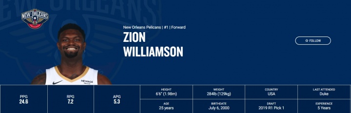 根據(jù)NBA官網(wǎng)數(shù)據(jù),上賽季錫安的注冊體重為284磅(129千克)。不過據(jù)多名消息人士透露,錫安上賽季體重遠遠超出這個數(shù)值,甚至有消息稱錫安曾一度接近330磅(150千克)。