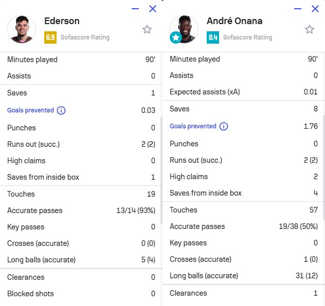 本場比賽,埃德森1次撲救(1次撲救禁區(qū)內(nèi)的射門)、2次成功出擊,19次觸球,5次長傳4次成功,獲評(píng)6.9分。奧納納8次撲救(4次撲救禁區(qū)內(nèi)的射門)、2次成功出擊、2次高球攔截,57次觸球,31次長傳12次成功,1次解圍,獲評(píng)8.4分全場最高。