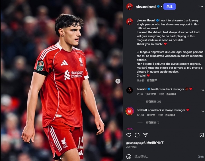 09月25日訊 據(jù)名記羅馬諾報道,利物浦18歲中衛(wèi)萊奧尼十字韌帶撕裂,將缺陣數(shù)月,爭取賽季末復出,萊奧尼剛剛更新社媒。