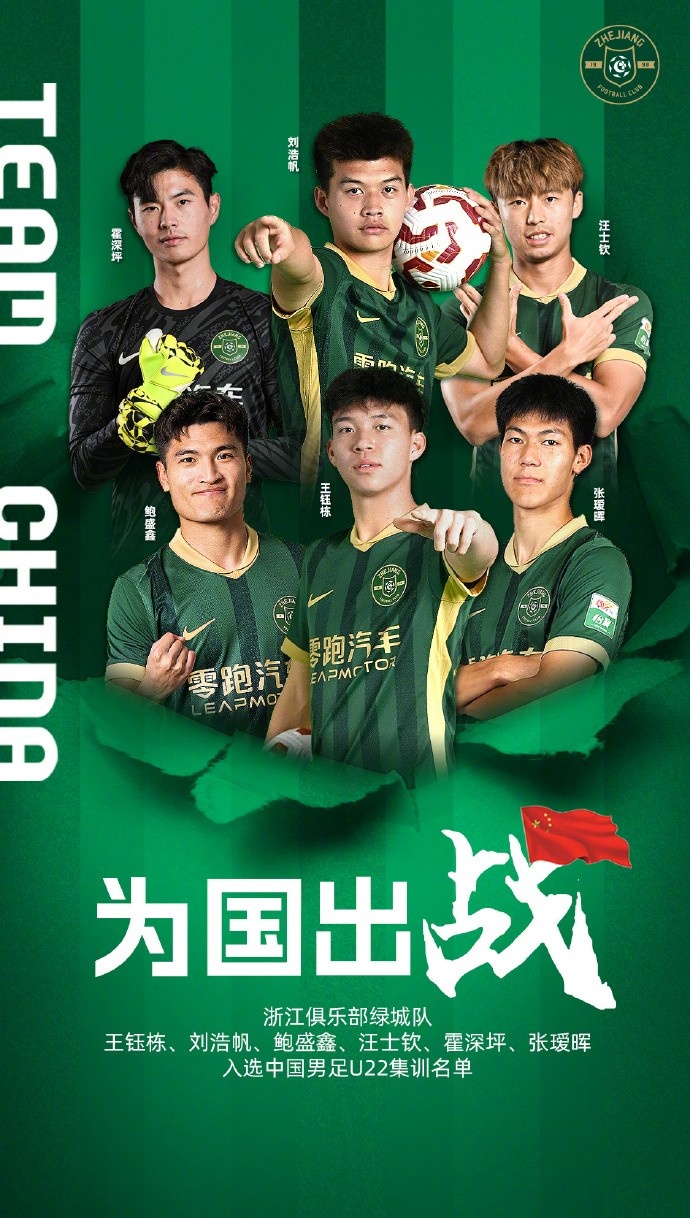 6人入選刷新了浙江FC隊史單次入選U22男足國家隊集訓名單最高人數紀錄。