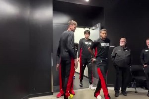 開拓者這賽前動員有流程的~楊瀚森與克林根擊掌碰肩,眾人圍一圈