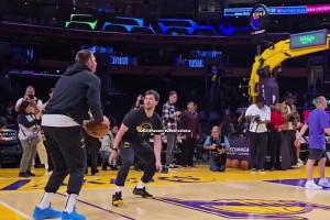 東契奇投籃熱身調(diào)戲訓(xùn)練師:來(lái)防我呀!然后調(diào)高弧度命中三分