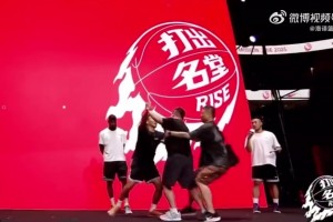 一名球迷大哥激動(dòng)沖上臺(tái)要跟詹姆斯擁抱,被主持人眼疾手快攔下了