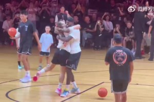 老詹給球迷表演一記暴扣,隨后做出霸王步慶祝姿勢,還擁抱李夢