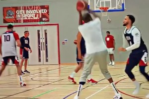 杜蘭特跳投,庫里的伸手只能防到腋下,這令人驚嘆的天賦啊